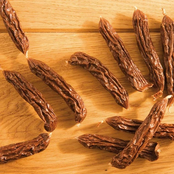 Ca. 2 Meter lange Wurst-Kette mit knackigen Pansen-Biffies. Da luftgetrocknet, sind sie fast geruchlos und haben trotzdem super viel Geschmack!