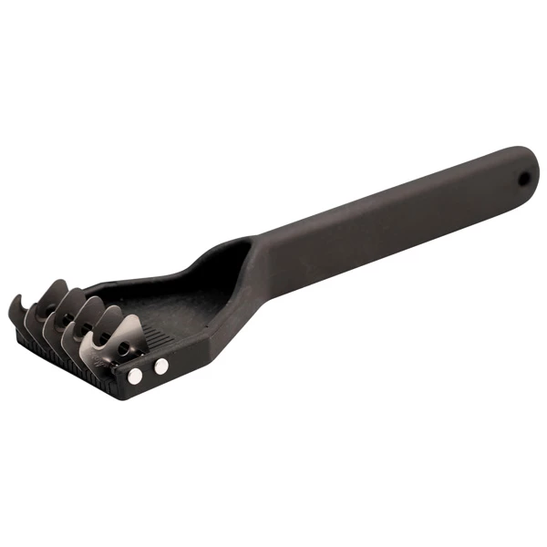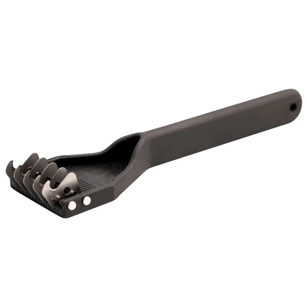 Der schwarze Kunststoffgriff dieses Striegels ist mit Glasfaser verstärkt und ist fest verbunden mit den rostfreien, gehärteten Edelstahlklingen (Klingenabstand 7,5 mm, grob). Durch die spezielle Geometrie der Klingen gleitet der Entfilzer schon mit leichtem Druck effektiv in das Fell und entfernt danach bis zu 90 % der toten und losen Haare. Der Entfilzer ist ideal für das Fell von rauhaarigen Hunden geeignet.