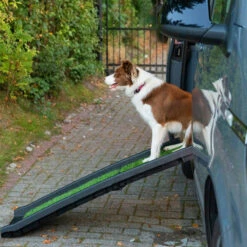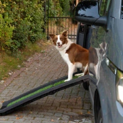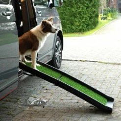 Die Lauffläche dieser Rampe ist mit Kunstrasen beschichtet, der dem Hund einen besseren Halt beim Begehen bietet. Gleichzeitig besteht sie aus robustem Material, lässt sich einfach zusammenklappen und dank des praktischen Tragegriffes überall bequem mit hinnehmen. Gerade für ganz junge oder ältere Fellnasen sowie Hunde mit Gelenkproblemen ist diese Rampe eine ideale Möglichkeit, ohne Mühe Steigungen zu überwinden – zum Beispiel beim Ein- und Aussteigen aus dem Auto. Nach dem Gebrauch lässt sich die Rampe einfach reinigen und sowohl In- als auch Outdoor verwenden.